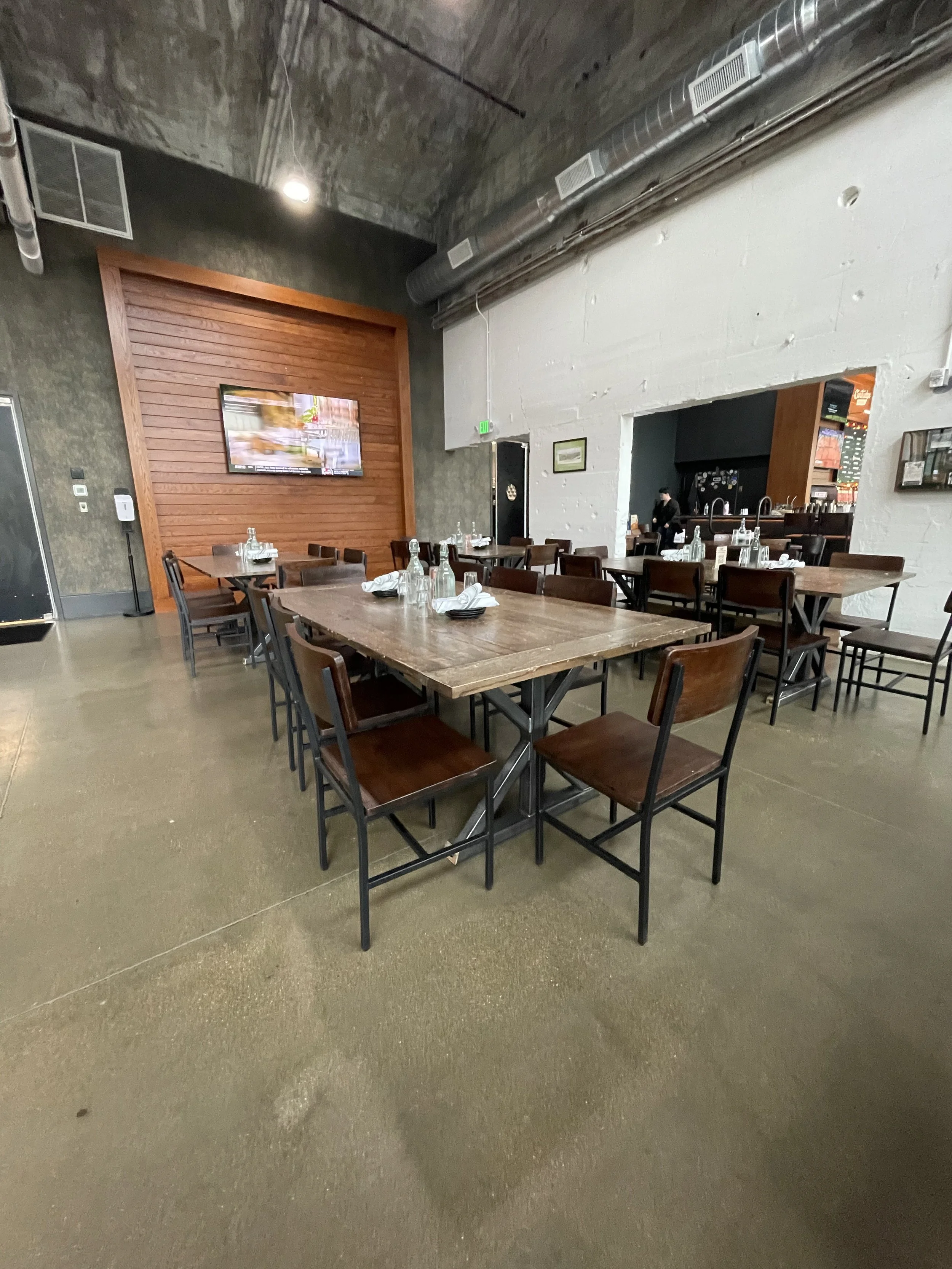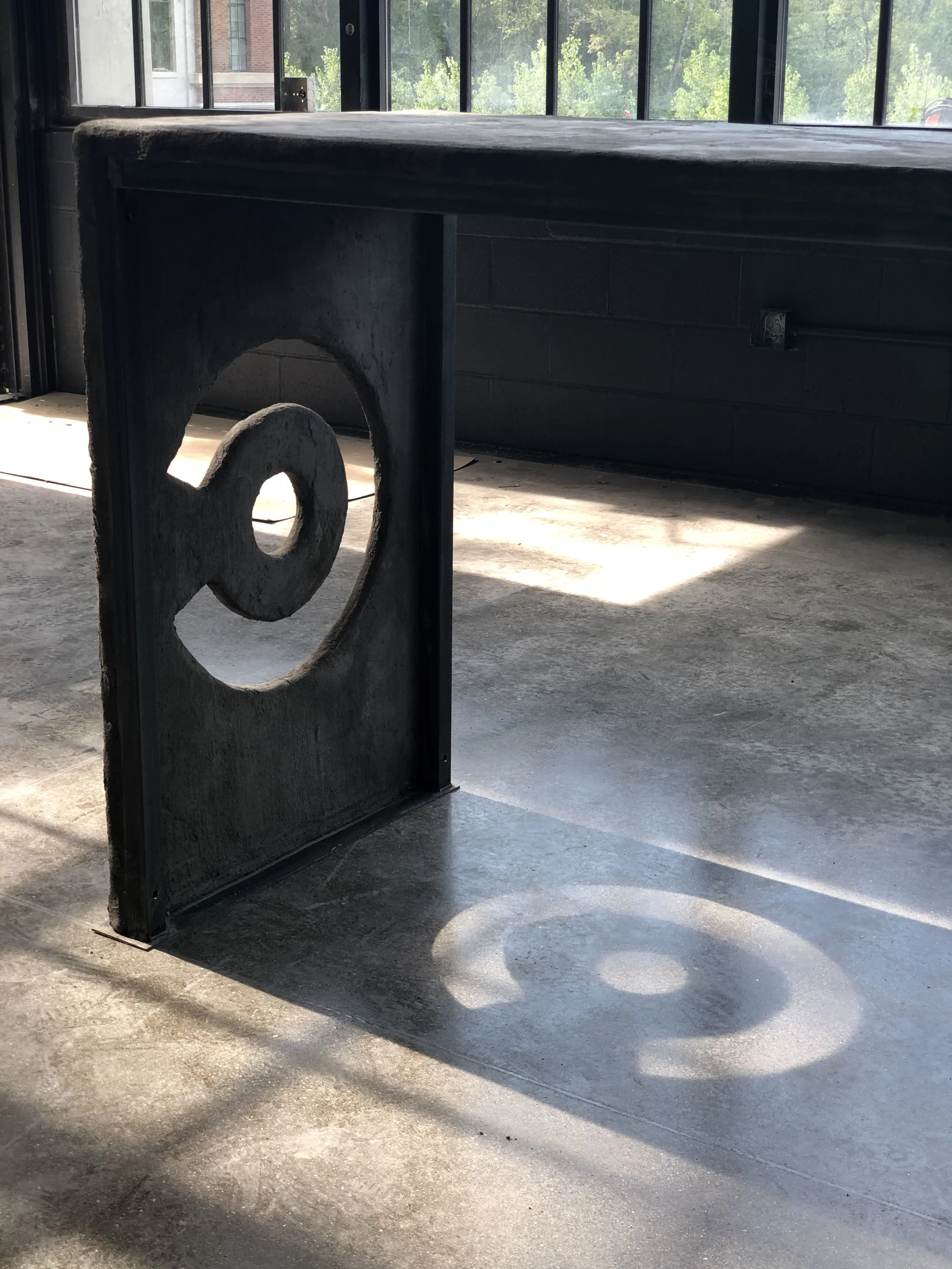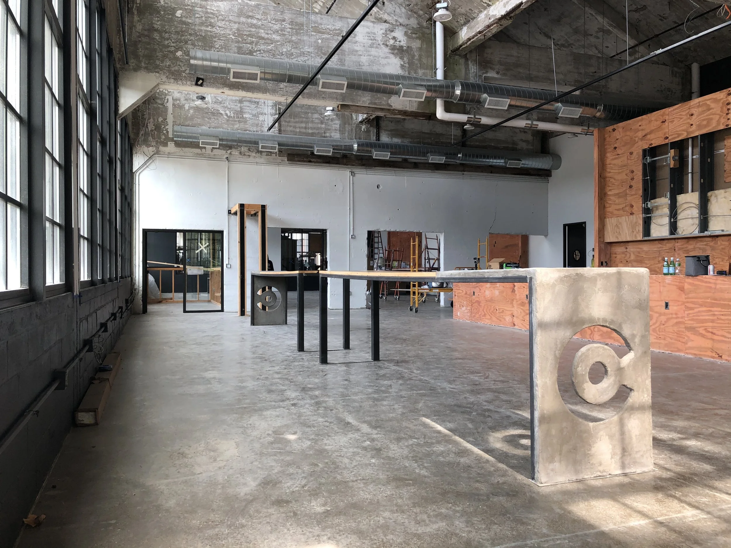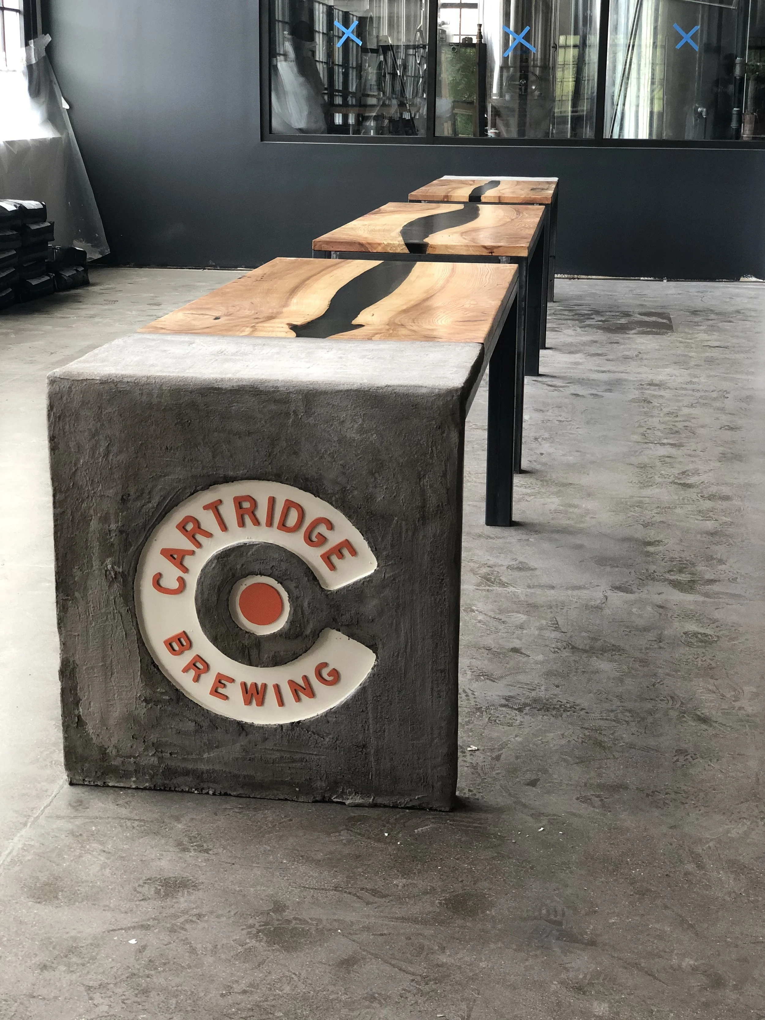 We started with five unique epoxy river tables. A pair, and a trio. Both sets bookcased by matching concrete waterfall edges that tie them into the building.
