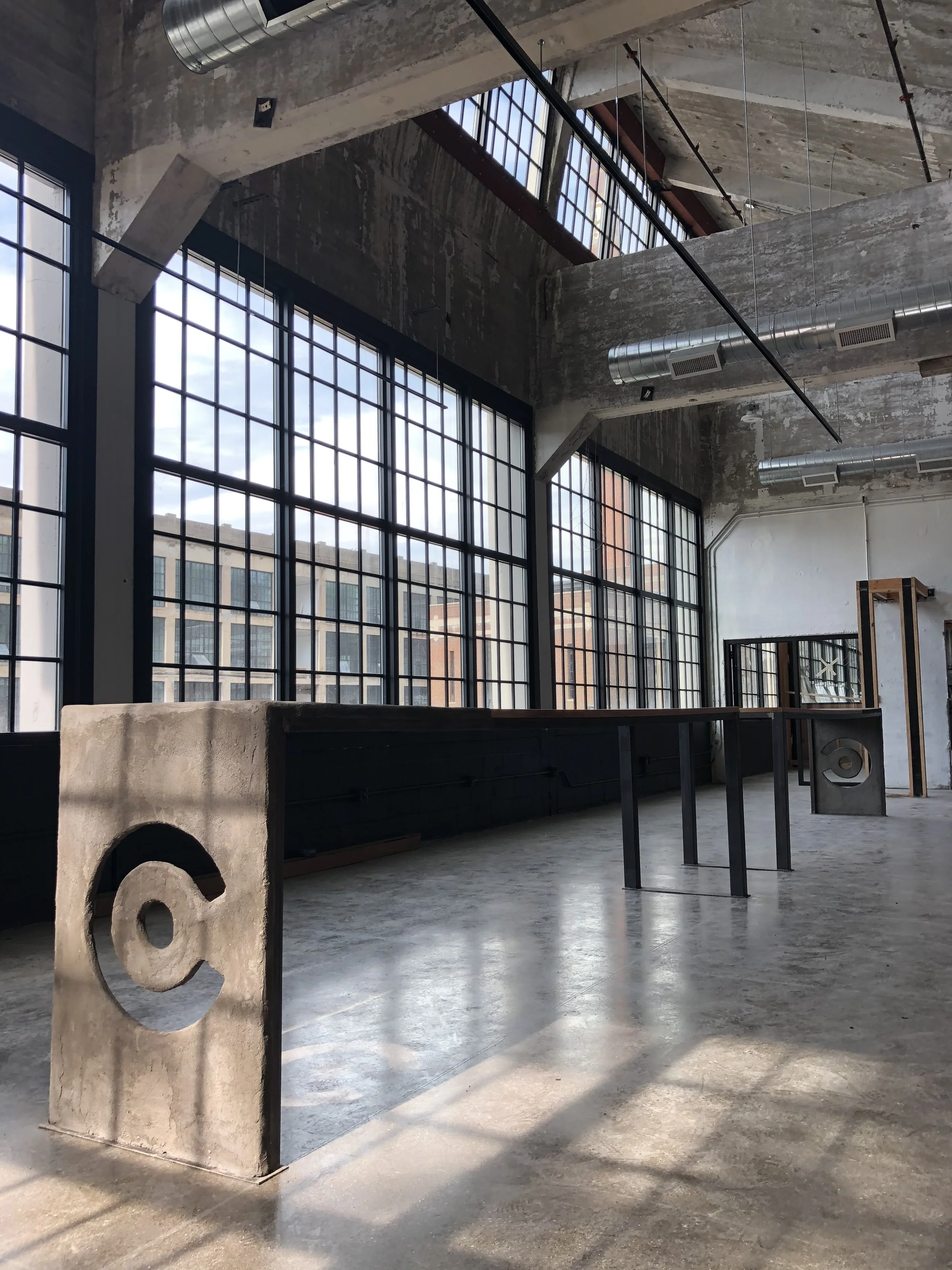 As needs changed, we built four farm house tables with metal trestle bases for durability, stained white oak tops, and some special touches. The bread boards feature brass medallions featuring the original 12 gauge shot shell Peters Cartridge head stamp, and the tops have 12 gauge steel shot embedded in the top. Both as an homage to the history of the building and iconic tower on site where shot used to be made.
