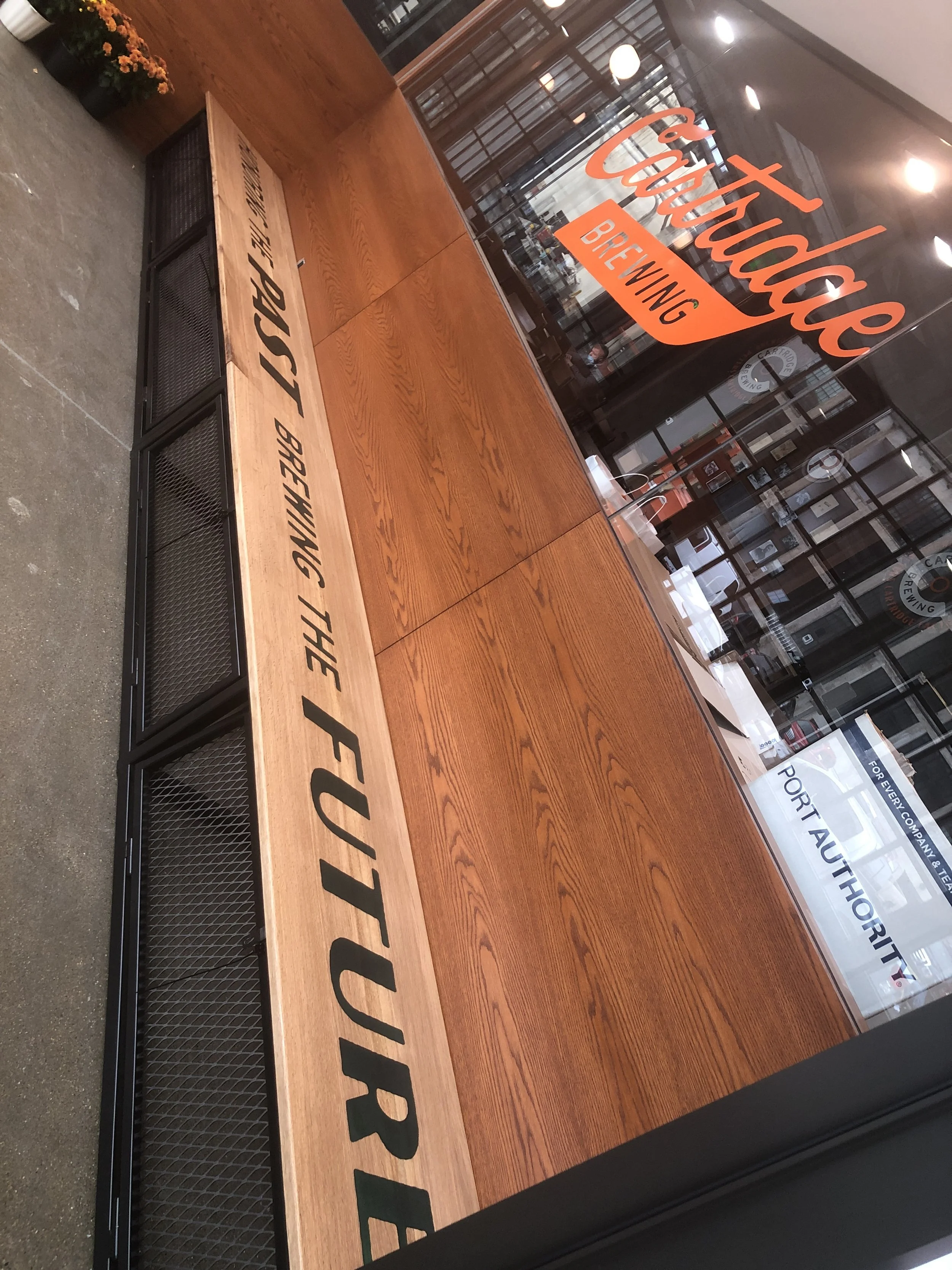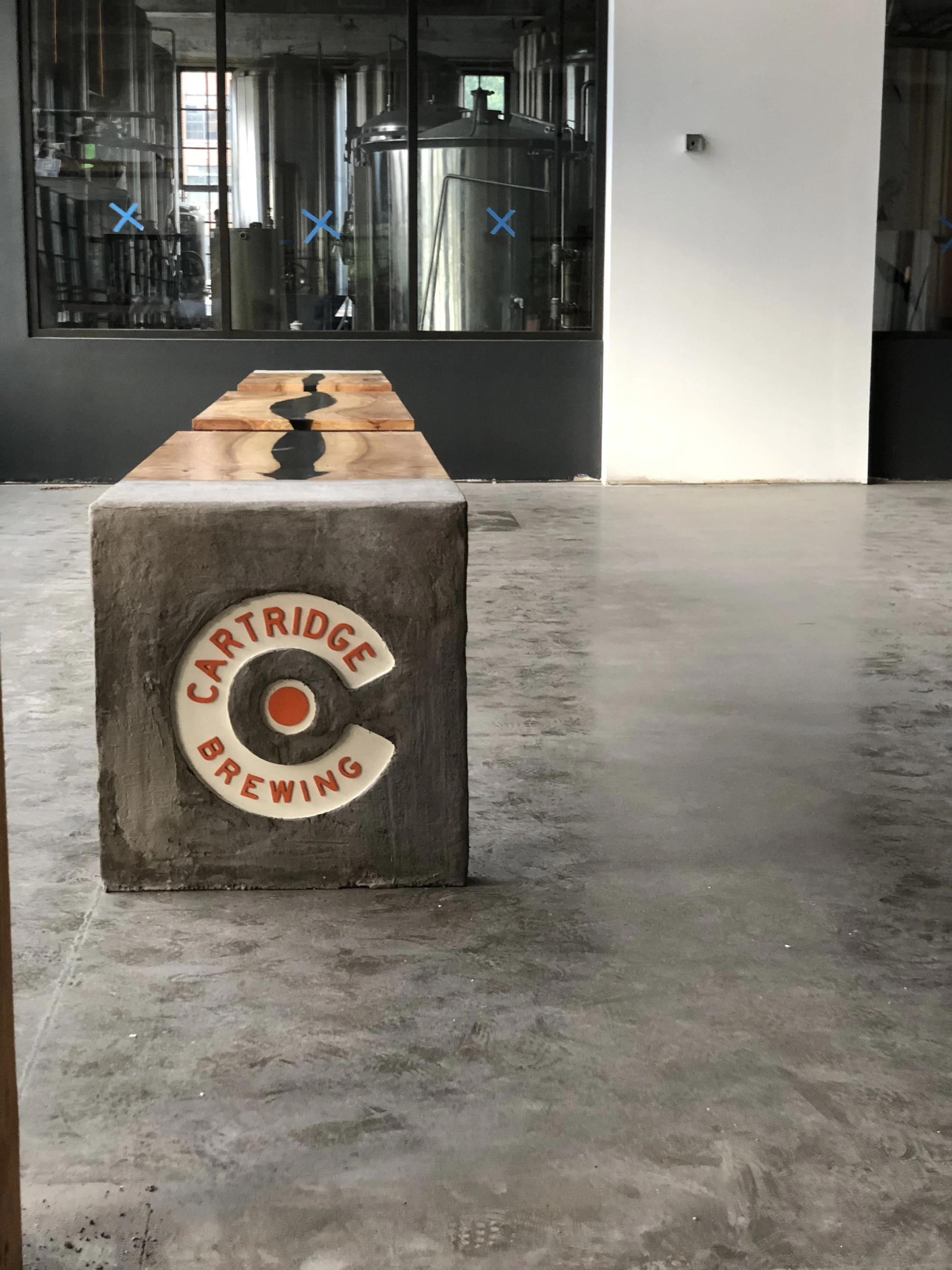 We also built a pair of benches that serve as storage lockers for the entry way that have the brewery’s slogan epoxied into the top, “Honoring the Past, Brewing the Future.”
