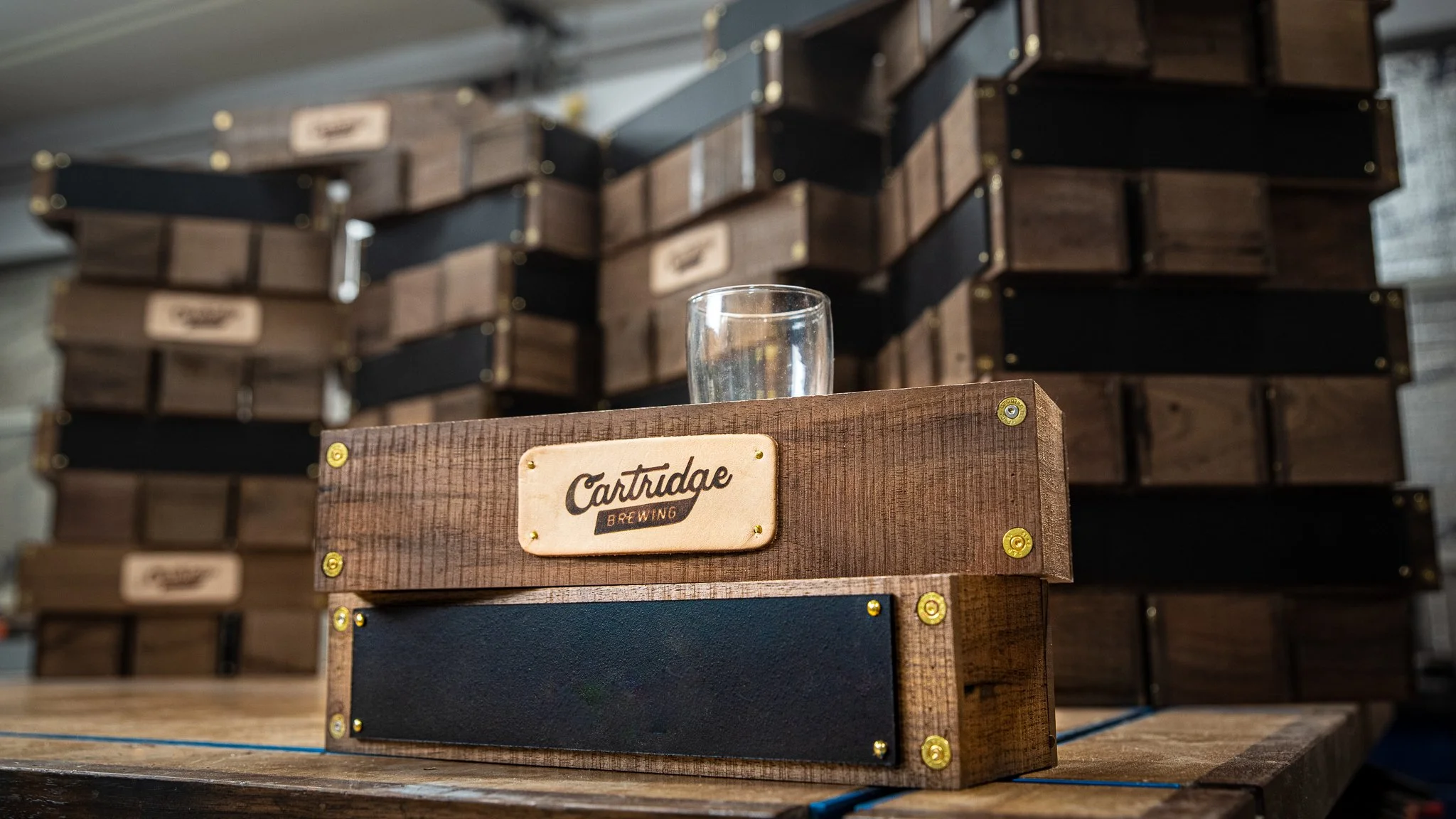 But that’s not all. We also had the honor to build Cartridge’s flight boxes to serve their beer flights. They’re rough sawn walnut and feature spent 9mm casings as the pins, branded leather badges on side, and blackboard panels on the other side.. so the flight can be labeled for each beer being sampled.